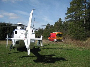 Pretty quickly, it became exciting. We were fairly inaccessible, though not as badly so as we might have been, considering we were almost at the top of a (smallish) mountain, because there was, for the first time that morning, open land nearby. A bright red ambulance service 4×4 came into view, then an ambulance, tossing about on the rutted track. The sapeurs pompiers had to walk down into the woods, carrying all their equipment and a stretcher, to see Micheline, who was now in quite a lot of pain. Then – wow! A helicopter air ambulance hovered overhead, looking for a landing spot.