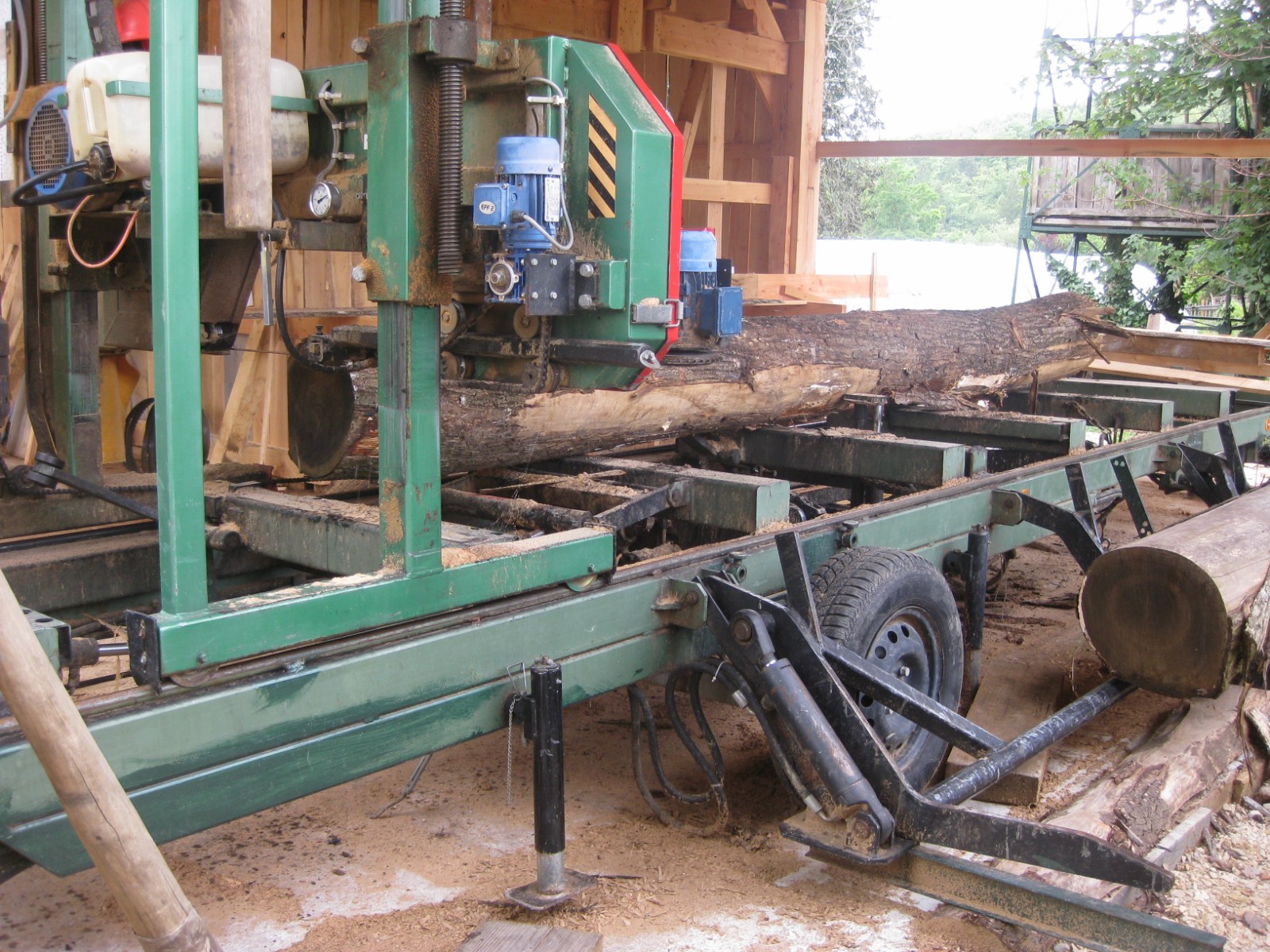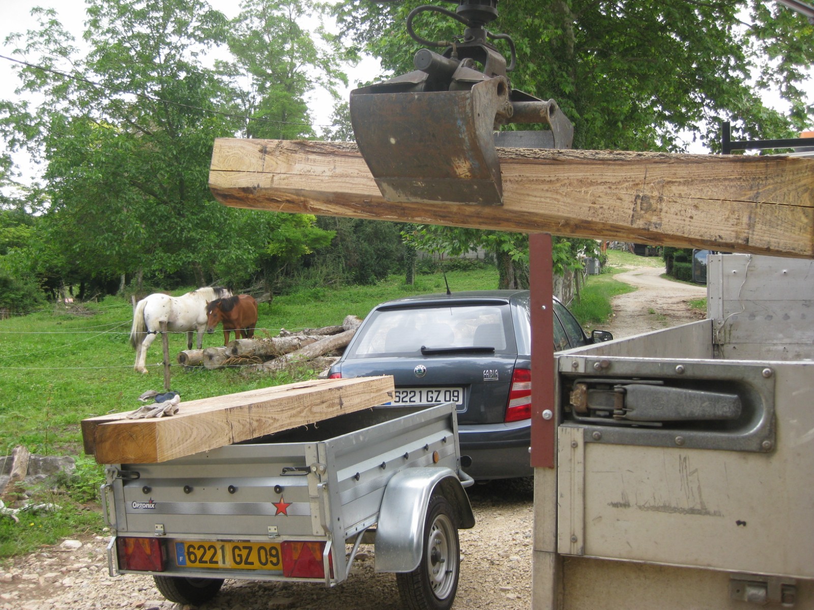 Robert trundles off with his large pick-up to select likely-looking logs while you stay and play with the cheerfully energetic dogs. Then he hoists the wood into his wonderfully large cutting machine which he somehow manoeuvred over himself from Poland, measures everything you your exact specification, cuts, trims….and hoists it onto your trailer or whatever.