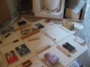 And so it was back to the bathroom yesterday. If you pride yourself on your DIY standards, stop reading now. Yes, that includes you Kalba and Sharon. Here is a picture of how we’ve worked out where the floor tiling should go. Lots of paper cut-outs, held in place by the contents of a book case. Well, when you’ve got an odd-shaped room, with not a straight wall in sight, what else to do?