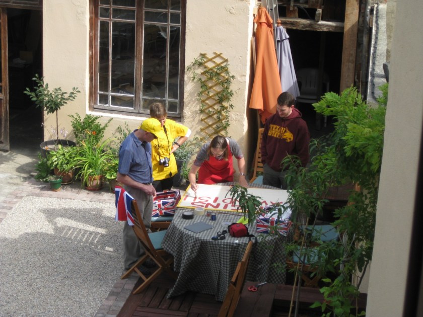 Previous Image Next Image TourdeFrance15thJuly2012 046 Team UK (Laroque branch) prepare a poster to support the British competitors.