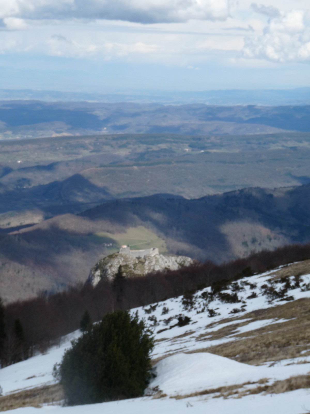 Previous Image Next Image MontségurRaquettesMarch2013 052 Can you just see the top of Montségur, far below?