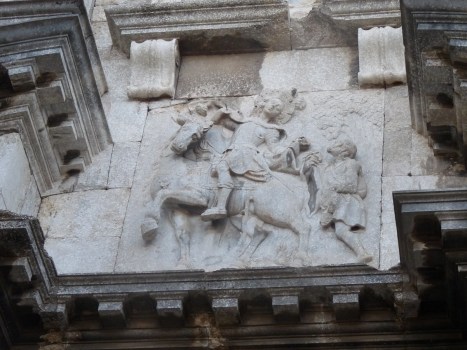 Previous Image Next Image P1050415 Climb dozens of steps, and you’re outside the battered church of Sant Domènec, looking at this frieze.