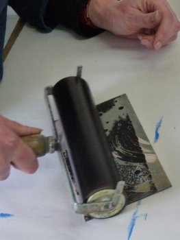 Hester rolls paint on her image: ready to print.