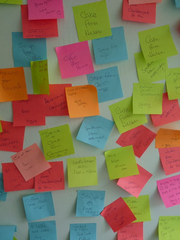 People who’ve donated money write a ‘serving suggestion’ on their post-it, and the café users who come in at 5.00 chose a couple of these, and hand them over in lieu of payment. They’ll eat what’s listed on the post-it. Here’s what some people have written: