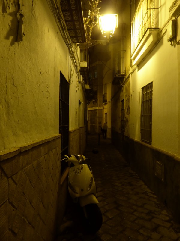 A narrow street by night.