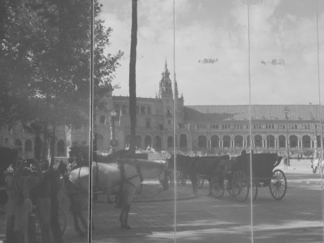 Previous Image LaRioja&SevilleOct2015 641 A view of Plaza de España, and the popular horse-drawn carriages of Seville, seen reflected in the windows of the public toilets.