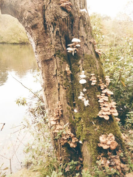 A fungus-colonised tree near the lake.