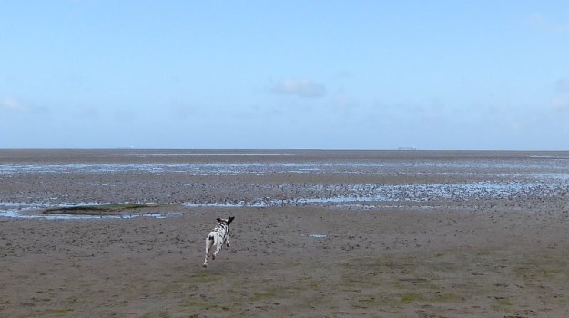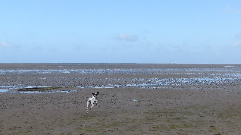Ellie and the boys’ dog Brian dashes for the horizon in Anglesey.