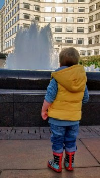 William and the fountain at Canary Wharf.