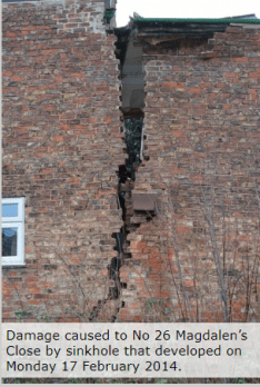 Previous Image Magdalen’s Close sinkhole, British Geological Survey Damage caused by the Magdalen’s Close sinkhole (photo courtesy of British Geological Survey)