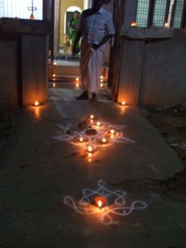 Previous Image Next Image 1727519-festival-lights-and-decorations-1 Rangoli decorations lit up in the street at night.