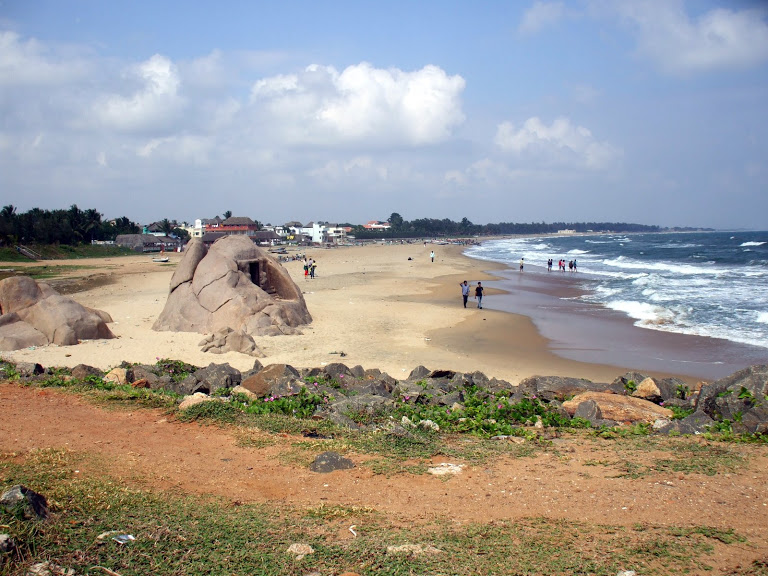 Night came and endless hours of listening to traffic and my fellow guests throat-clearing and spitting. So at 6.30 I got up, wrote and delivered a note to my host, and got a rickshaw to the Bus Stand. Let me tell you it’s not easy when three different people give you three different bus numbers, and three different stops, and the bus destinations are only in Tamil script, but I was determined to get to Mamallapuram good and early, so I coped. Chaotic Chennai traffic eventually gave way to palm trees, lagoons, and views of the sea, Finally I was happy.