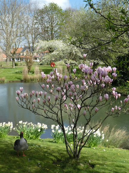 Previous Image Next Image P1060833 (1) Back in the village, a greylag goose guarded the village pond, hissing at me as I paused to admire narcissi, a magnolia, and beyond these, early cherry blossom.