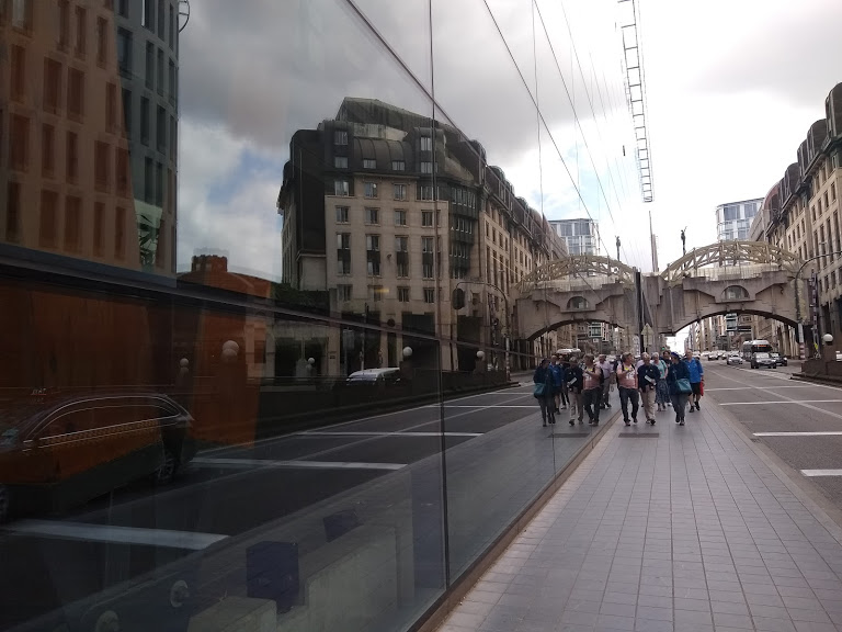 Previous Image Next Image MVIMG_20190708_153839496 Now we’re in Brussels. I quite like it that the street’s more easily seen in the plate glass reflection. And that the lines on the window, and on the pavement are also working towards converging.