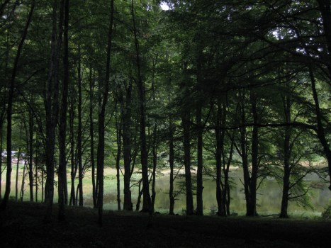 Le lac de Moulzonne glimpsed through the trees at 8.00 a.m.