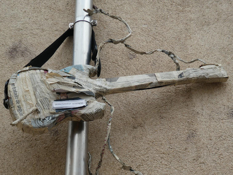 Walking down a street in Barcelona, we spotted this papier-mâché guitar suspended from a drainpipe.