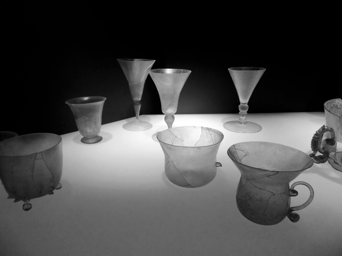 In the last image above, you can see at floor level the excavated city beneath. Here are some of the everyday objects the archaeologists found: plates, chocolate cups and glassware, all made locally.
