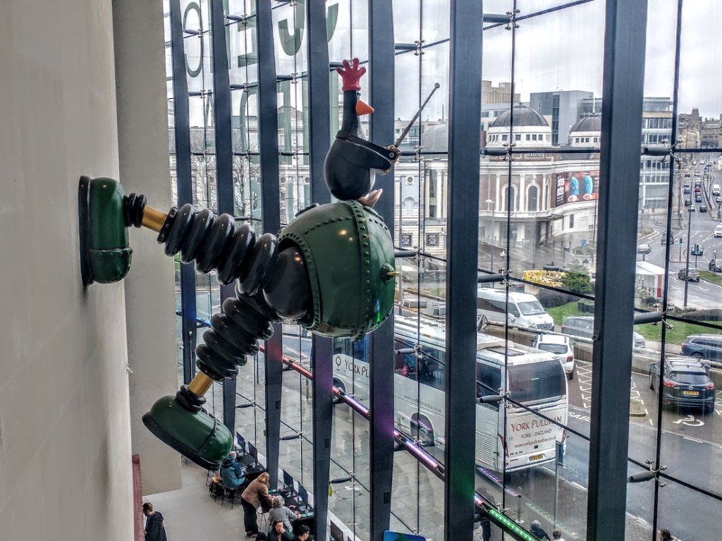 Team London and I visited Bradford on Friday to spend time in its Science and Media Museum. And here we found Feathers McGraw, anti-hero star of The Wrong Trousers and Murder Most Fowl. Surely he should still be locked up at His Majesty’s Pleasure, instead of gazing out of the windows of the museum?