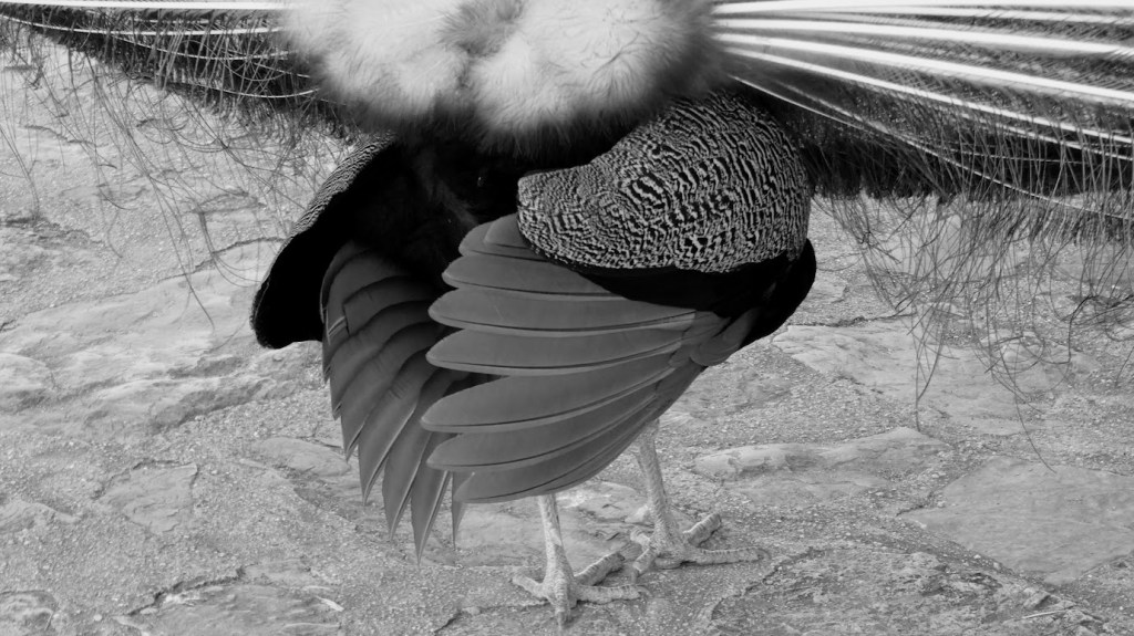 Just as I thought this peacock could afford to show off his wing feathers, and I could for once ignore his splendid tail display.