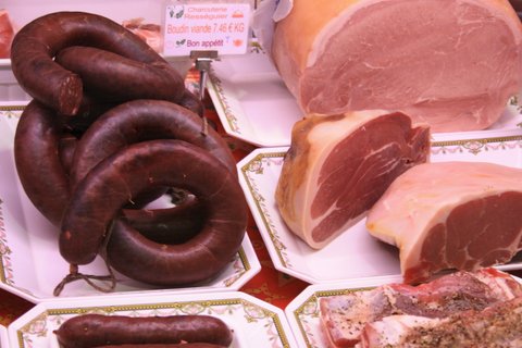 Black pudding and hams.