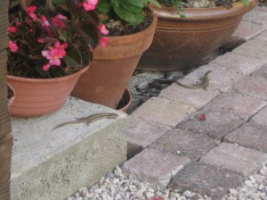 Summer’s arrived: well, this week anyway. So from before breakfast until long after the evening meal we’re spending as much time as we can out in the garden. And we have plenty of company. Lizards. Common wall lizards, podarcis muralis. They are indeed spectacularly common here. We have no idea exactly where they live, but there are plenty who call our garden ‘home’. We’re beginning to get to know a few.