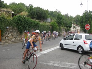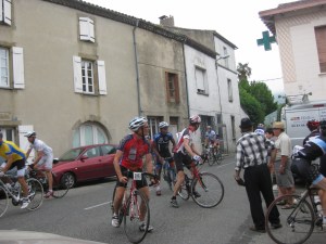 The two first groups were due to cycle through Laroque, and we locals were ready at 10 o’clock, lining the streets to cheer them on. L’Ariégeoise marshals with Stop-Go batons in red and green strutted about importantly, directing the traffic, stopping and diverting cars as necessary.
