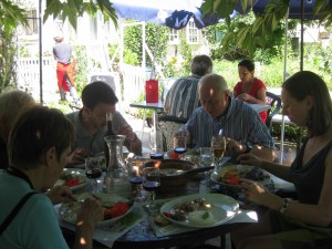 But after eating, drinking and lots of talking, it was time to dance. Zingazanga had been playing loudly throughout the meal, but they turned their attention to teaching us simple steps and dances from centuries ago. Even I with my two left feet joined in.