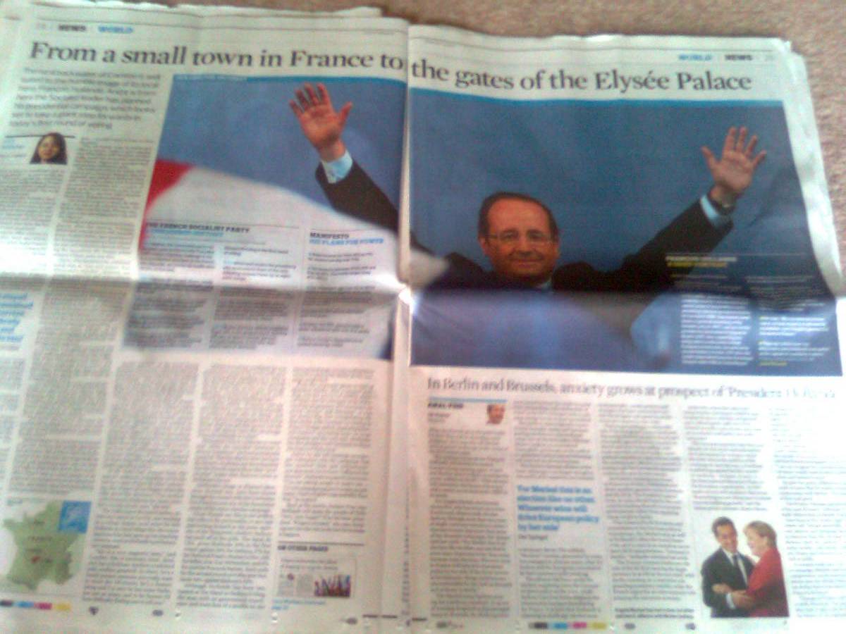 Actually, she needn’t have worried. I’ve been surprised at how thoroughly the French elections have so far been covered. The broadsheets, and both radio and television could be relied on to have some slant on the campaign every day. Much of the discussion has revolved round how the Franco-German alliance would fare if Angela Merkel has to forge a relationship with Hollande rather than Sarkozy. Other articled focussed on how, for many voters, it was perhaps more a question of who to vote against, rather than who to vote for.