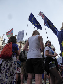 Despite our serious purpose, we had fun. Look at the banners, the flags, the posters, the facepaint and wigs; the young, the old: marching, hobbling, manoeuvring wheelchairs and buggies – you’ll even spot one fellow being carried by Donald Trump (as if …). We enjoyed Mexican cheers (the vocal version of a Mexican wave), bouts of chanting (‘What do we want?’ ‘A People’s Vote!’ ‘When do we want it?’ ‘Now!’). We chatted with marchers from Wales, Devon, Germany, Reading, France, Lambeth, Scotland…..
