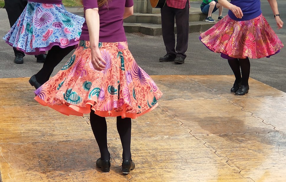 We could watch the swirling-skirted clog-dancers rhythmically and musically clickety clacking their clogs.