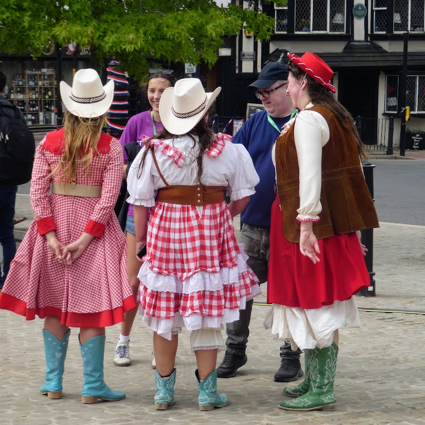 Ripon Theatre Festival this last weekend: and Saturday and Sunday brought street performances and spectacles all over town. Best of all was that despite the incessant rain and intermittent thunder we were threatened with, not a drop fell while we were all out and about enjoying ourselves (and performing too, in the case of choirs like mine). But. What a cheek! Hardly anyone was decked out in red! I’m relying on photos from previous years to plug the Red Gap.
