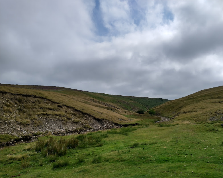 Most of our hike wasn’t in such favoured countryside. We slogged up to the bleaker moorland where once lead was mined, and no farmer could make any kind of living, unless he kept sheep. Here there are no villages, no houses or farms, and few roads.