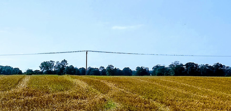 See these? These are swallows on a telegraph wire in mid-September one year recently, assembling prior to their big autumn migration. It didn’t happen this year. Swifts and swallows are on the edge of viability here, from habitat loss.