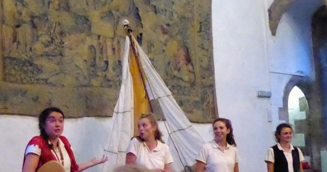 The Castle has a Great Hall. Performing here rather than on a soggy greensward seemed a better idea in the circumstances. And it was. During the evening it rained. And then rained again. The audience never noticed a thing. We were too busy admiring the way four women became twenty or more people.