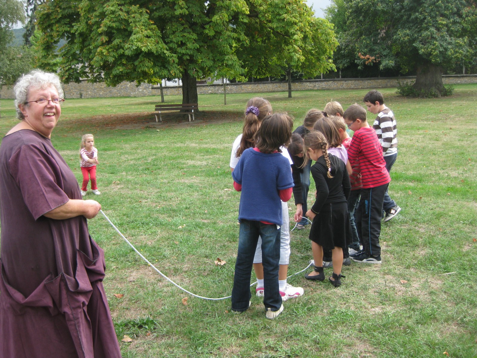 Lunch break. Afterwards, the children came to see our long-prepared exhibition looking at North Yorkshire, which has so many features in common with the Ariège: mountains (OK, the best Yorkshire can manage is Whernside’s 736 metres. Ariège’s Pic d’Estats is 3143m); textile and mining industries past their glory days; wide open spaces home only to sheep…. and so on. They enjoyed an extract from Roald Dahl’s ‘George’s Marvellous Medicine’, and then it was back to the Centre de Loisirs. Where we produced a long skipping rope with the idea of teaching them a couple of English skipping games…