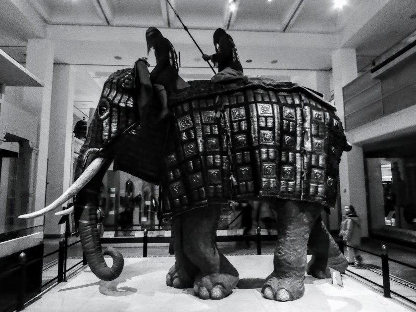 … then onto the newly developed banks of the River Aire. Industrial grot has been replaced by both student and up-market flats, and the featured photo shows the view of Leeds old and new. The Royal Armouries Museum was supposed to be our destination, but at half-term it was way too busy, so we didn’t stay long . Here’s a taster, showing that even horses and elephants can get togged up for war, and that swords never seem out of fashion.