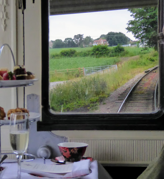 As we rattled along, enjoying countryside views, smart serving staff plied up with elegant little sandwiches, properly fattening cakes, and the all-important scones served with jam and cream. And tea, of course. And prosecco.