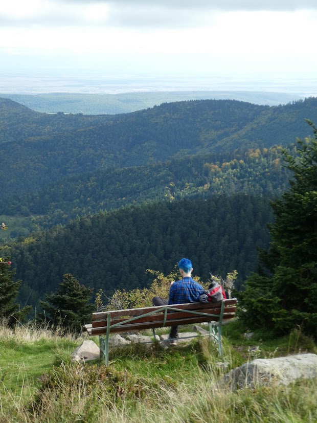 This is by way of being a preview for Jo’s Monday Walk tomorrow. It’s a viewpoint near le Petit Ballon in Alsace, but as you see, the Boy with Blue Hair Bagged the Bench first. I still offer it for Jude’s Bench Challenge.