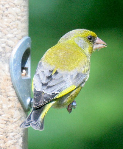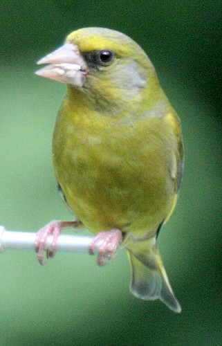 The other greenfinches didn’t seem to care. All day they’ve been wheeling around, careering from sunflower seed feeder to peanut net, to grain dispenser, always feeding, feeding, dropping discarded shells and tiny crumbs onto the ground beneath, where all the birds, whether finches or regular residents, continued to scavenge all day.