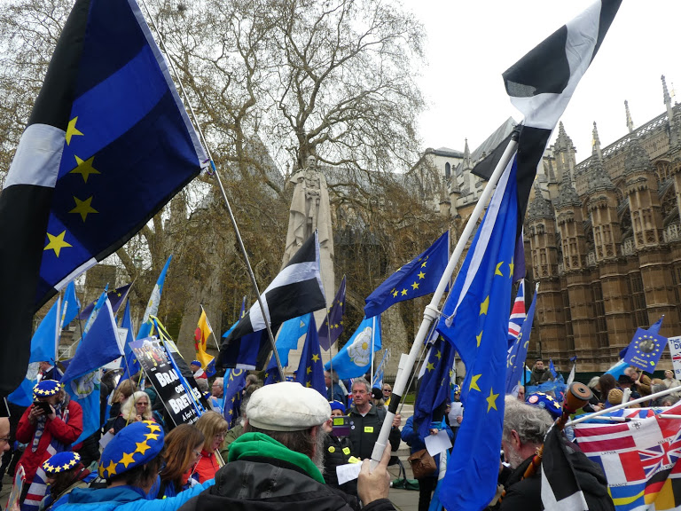 On Monday, two coaches arrived in London. One from the north, stuffed not only with Remainers in good voice, but Yorkshire flags by the dozen, European flags, Union flags, placards, and Mark’s tuba. Oh, and seven students from Sheffield University, hitch-hiking to Transylvania for charity, via our demo. And a coach from the south-west, idem, except that they had black-and white Cornwall flags and placards, and a Cornish bagpipe instead of a tuba. And no students.