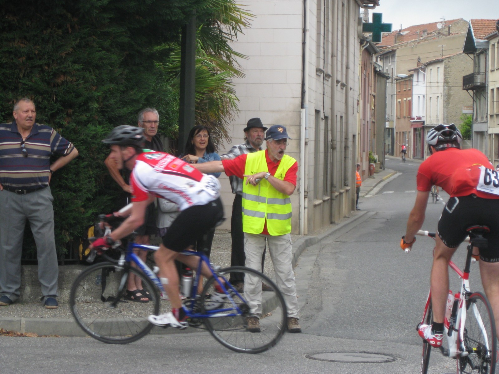 The two first groups were due to cycle through Laroque, and we locals were ready at 10 o’clock, lining the streets to cheer them on. L’Ariégeoise marshals with Stop-Go batons in red and green strutted about importantly, directing the traffic, stopping and diverting cars as necessary.