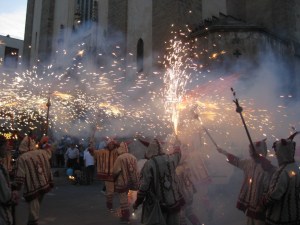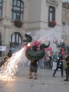 Showers of golden sparks spun into the crowd as the children wheeled and pranced through their routines. It turned out though that this was the Grand Finale. Market stalls were beginning to pack up. The ‘gigantes’ were shrouded in dust sheets and slid ingloriously into workmen’s vans, and once again the crowds finished off the evening in the bars and restaurants.
