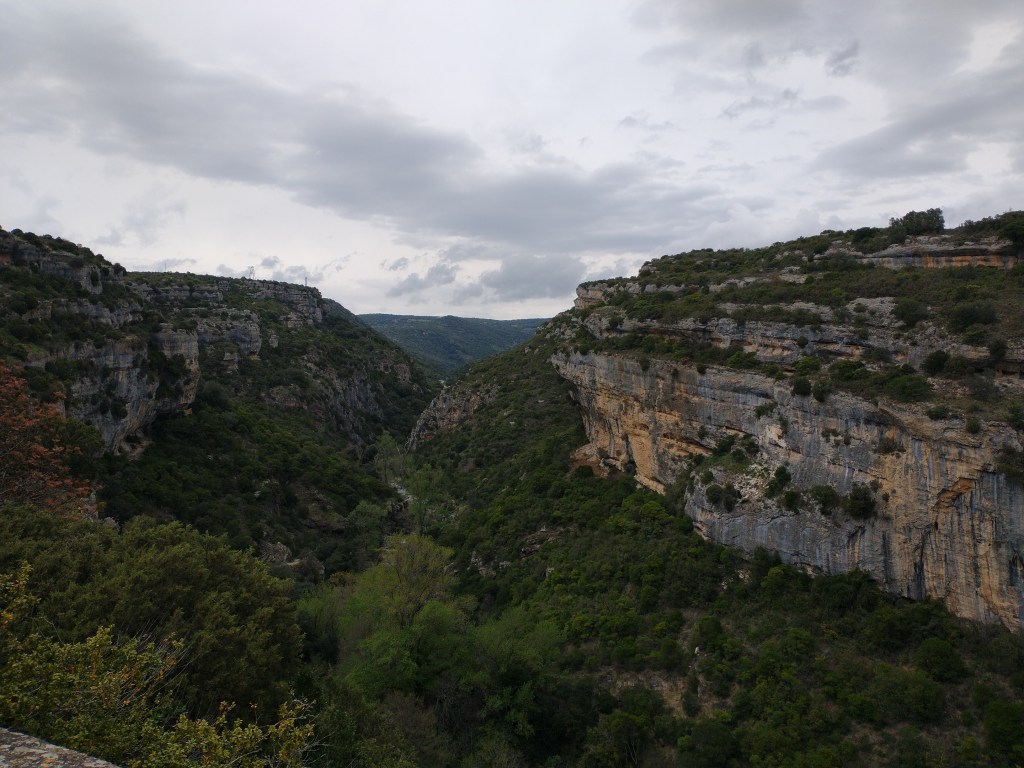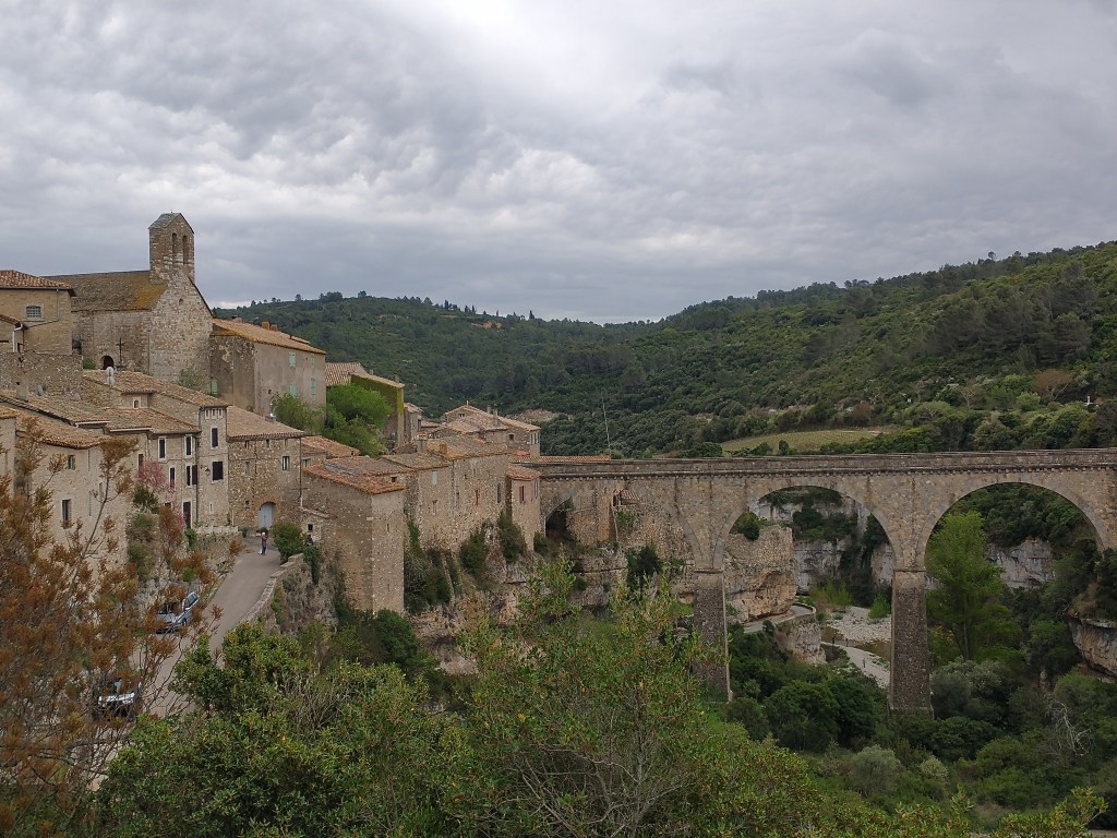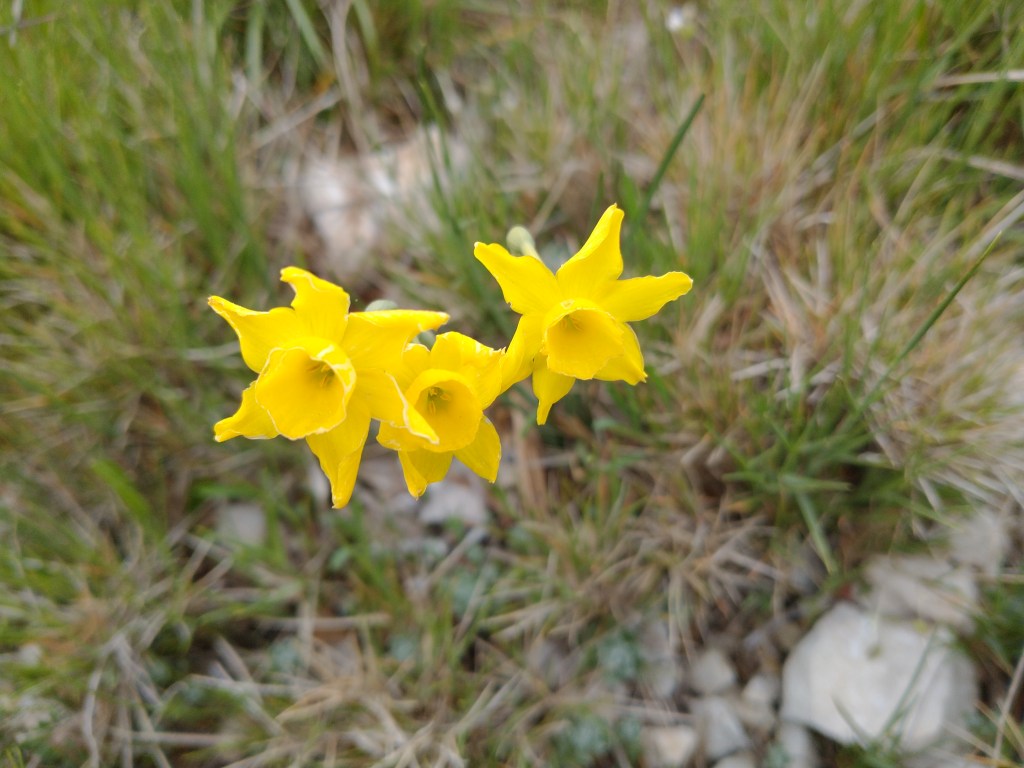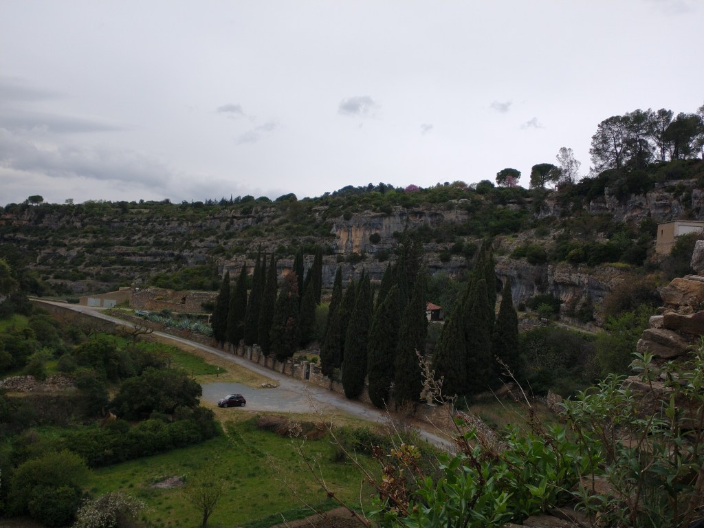 The landscape near Minerve, and out in the midst of it wild daffodils, a mere eight centimetres high. Blurry photos? Windy day.