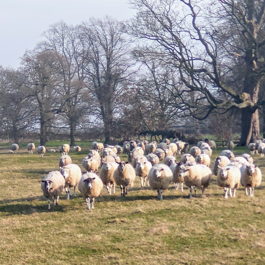 Yesterday, out for a local walk, I passed another nearby field, with perhaps a hundred sheep. A few of them noticed me, and just like their sheepy cousins next door to us, they set up a baa-ing announcement. ‘Possible food alert! Come on guys!’ And every one of them turned towards me and galloped to see what I had. Which was nothing.