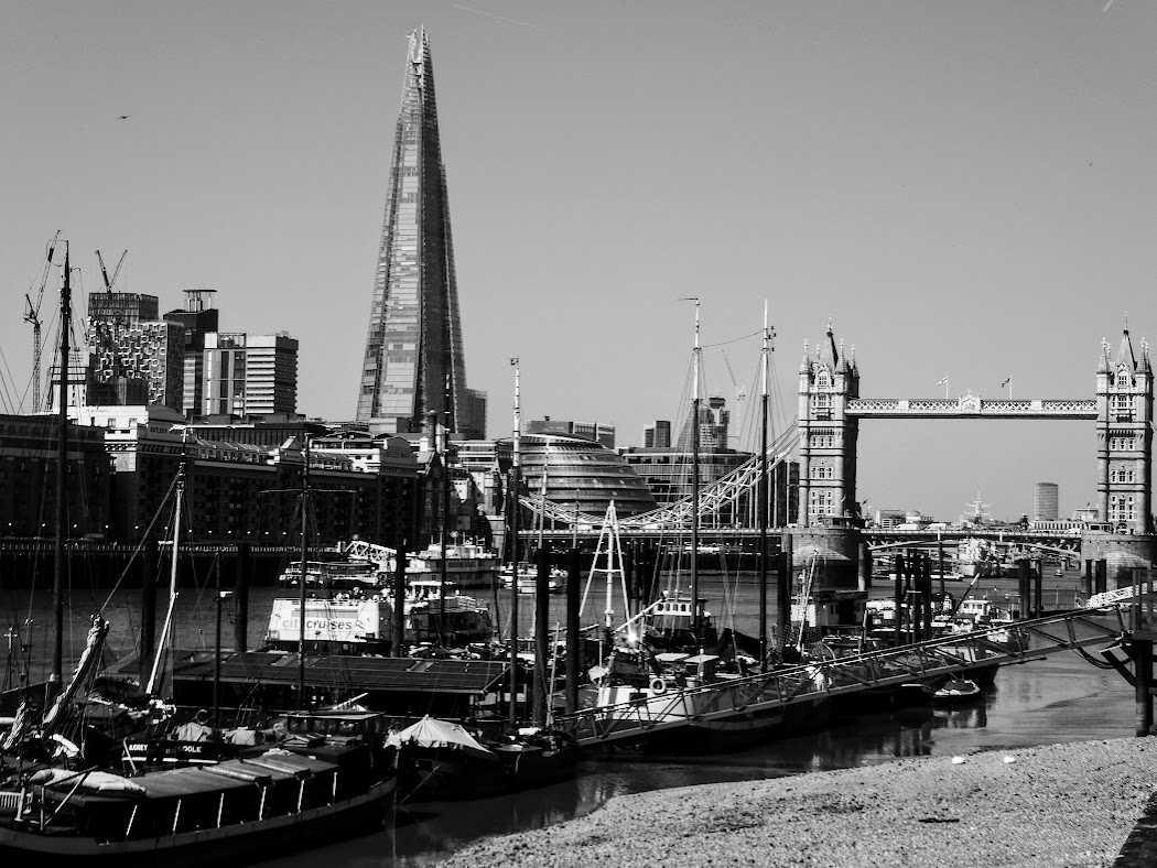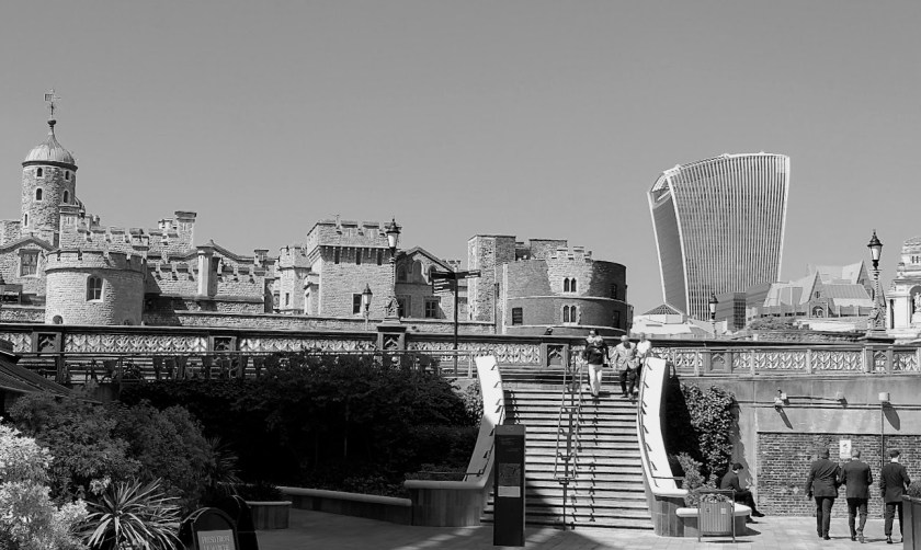 I didn’t stay long near Tower Bridge, built in 1886 or the Tower of London, built in 1066, both log-jammed with visitors. But the contrast between the very old and the extra-new captured in this shot appealed to me.