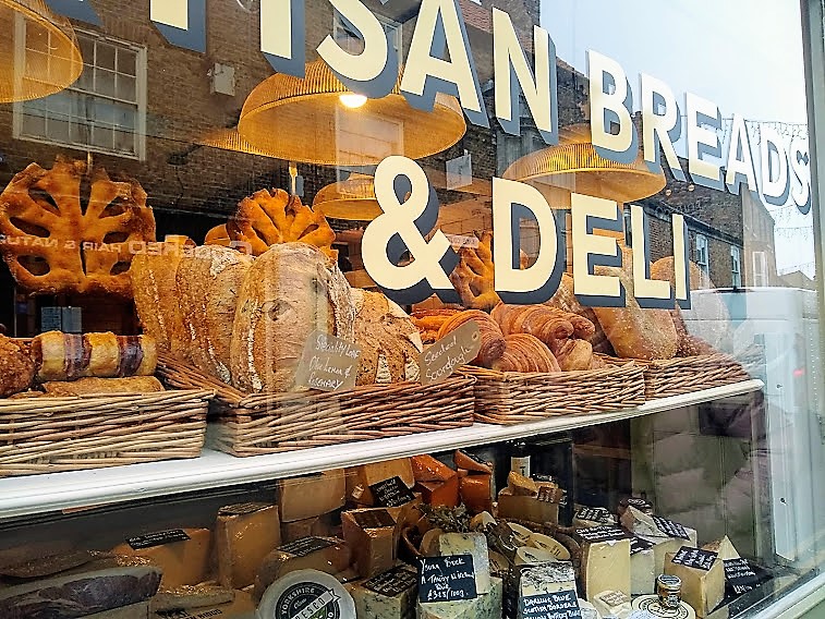 Let’s come back to England now, and stay local, in Ripon. We’ll pop into our favourite bakery, then saunter along to the pie shop. In both cases, reflections will offer us views of the street too.