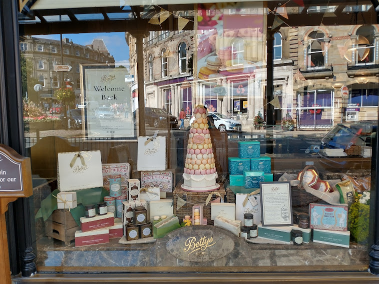 When Sheree read my post about window shopping last week, where I’d included a stop-off in Harrogate, she was disappointed I hadn’t included the windows of tea shop and bakery extraordinaire, Betty’s. I was in Harrogate again last week, and realised I had to put this right. But the sun was so high, and the light so bright that my camera got clearer views of Parliament Street behind than of the window display. Never mind. Two for the price of one.
