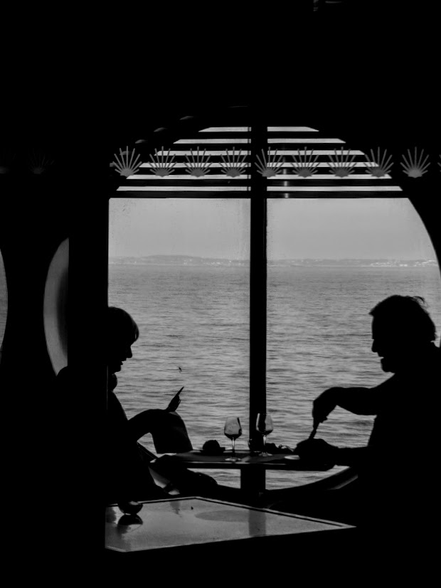 I have no idea who this couple are. But they were enjoying a meal, a glass of wine, with the sun shining over the coast we were heading for.