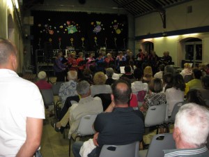 We’ll have concerts in the communities nearby. And every now and then, as last week, there‘ll be a ‘Rencontre de Chorales’, when a number of choirs from a wide area gather together for the afternoon and invite the general public in for a feast of singing. Each choir sings about 6 numbers from their repertoire, catering to every possible musical taste. And we all sit together in our concert get-up, sympathising with mistakes, applauding great performances until our own turn comes. At the end, every chorister from every choir will somehow squeeze onto the stage to join in the ‘chanson en commun’. The audience enjoy it, but it’s even more fun for we singers to join together, united by our love of singing. As we all suggested last week at the tops of our voices, ‘C’est magnifique’