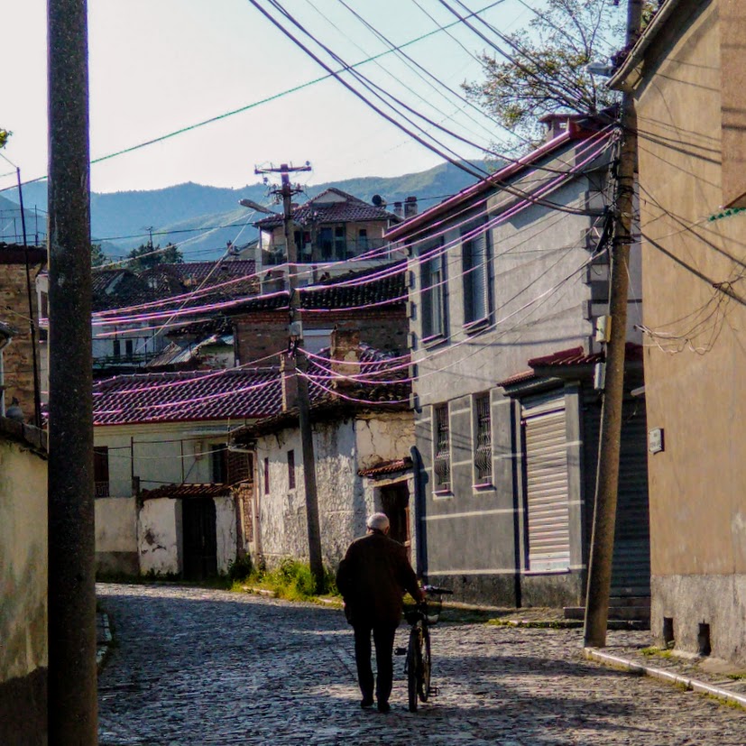 Let’s go into town. A cobbled street, the shadow of a lamp standard ….